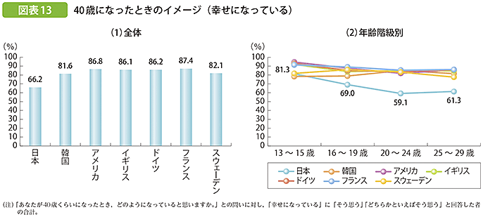 自分の将来に希望を持っている割合(図表12)は6割強、40歳になったときに幸せになっていると思う割合(図表13)は7割弱で、いずれも諸外国の中で日本が最も低いことが明らかにされています。年代が高くなるほど、その傾向は顕著となります。