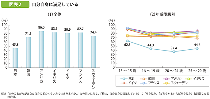 …内閣府が公表している「子ども・若者白書」(平成26年度版)によると、日本の若者は諸外国と比べて、自己を肯定的に捉えている者の割合が低く、自分に誇りを持っている者の割合も低いことが明らかになっています(図表2)。