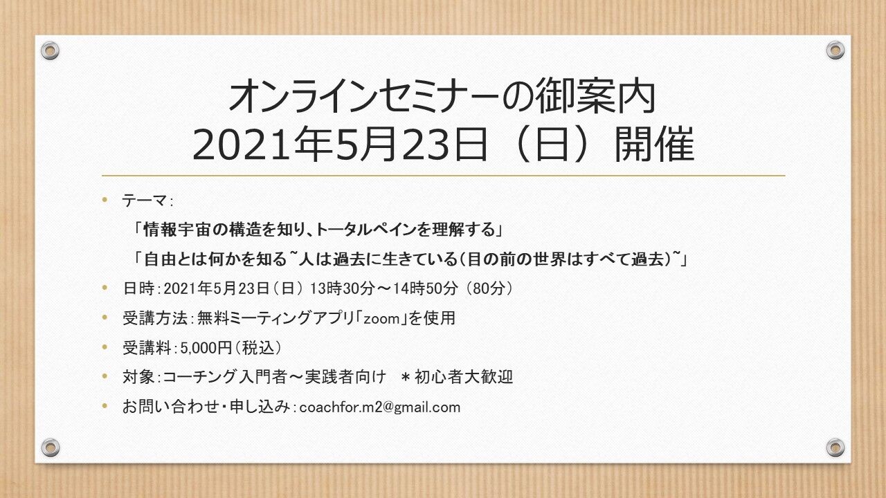 第2回目は2021年5月23日(日)開催。テーマは「情報宇宙の構造」「トータルペイン」「自由」「時間の流れ」です。詳細はこちらから↓