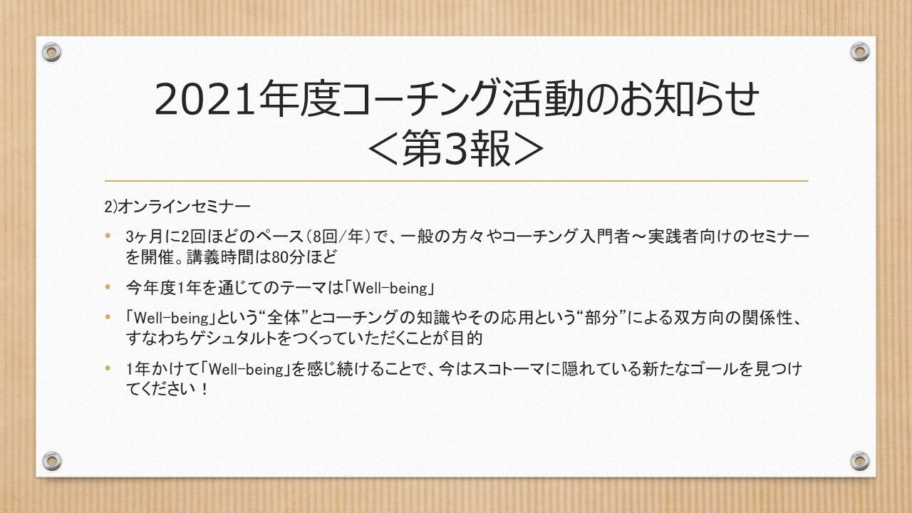3ヶ月に2回ほどのペース(8回/年)で、一般の方々やコーチング入門者~実践者向けのセミナーを開催します。時間は80分ほどです。