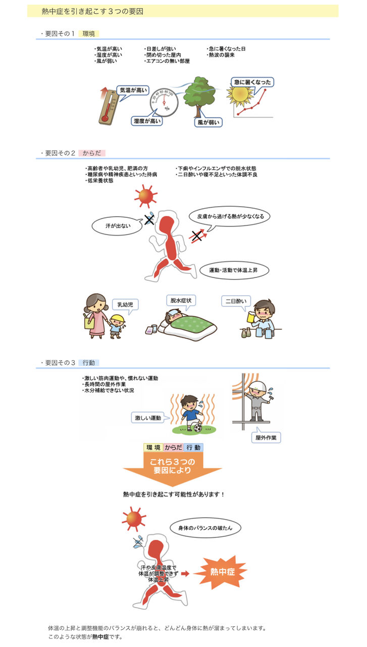 1)環境省の熱中症予防サイトには、「熱中症の基礎知識」として3つの要因が掲げられています。「環境」「からだ」「行動」です。まずは、その3つを確認してください。