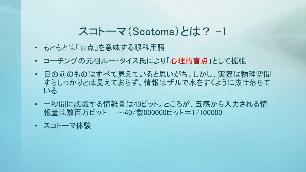 スコトーマを体感していただきながら、ゴール、エフィカシー、コンフォートゾーンといったコーチングの基本用語について解説しました。私たち一人ひとりが潜在的に持つ才能や能力、可能性といったものを存分に感じてほしいと願いながら話をしました。