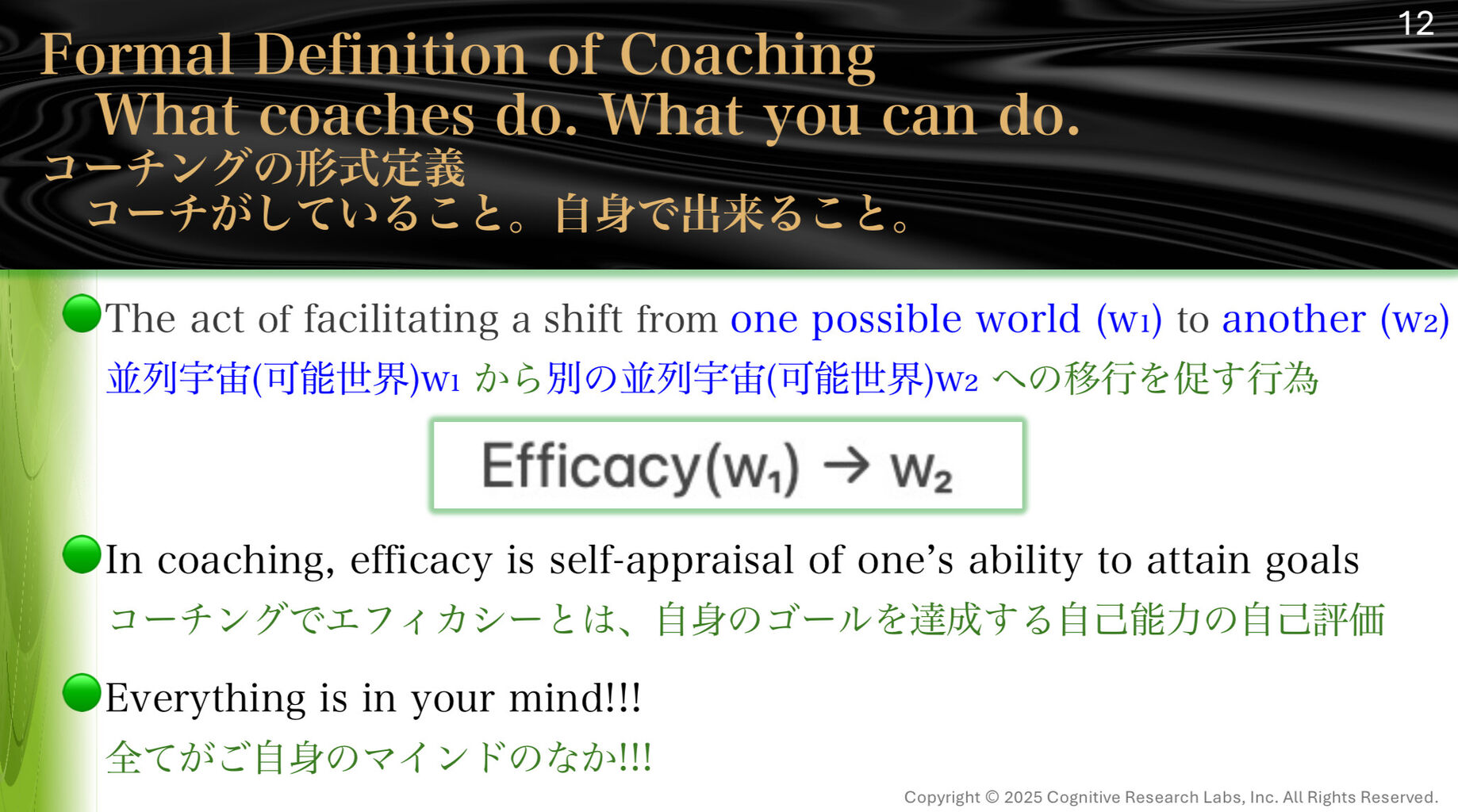 そのためのセルフトークが、「私らしくなかった。次は〇〇している」。このようなセルフトークを重ね、共有するゴール側の世界(未来)の臨場感を上げていくことが重要です。